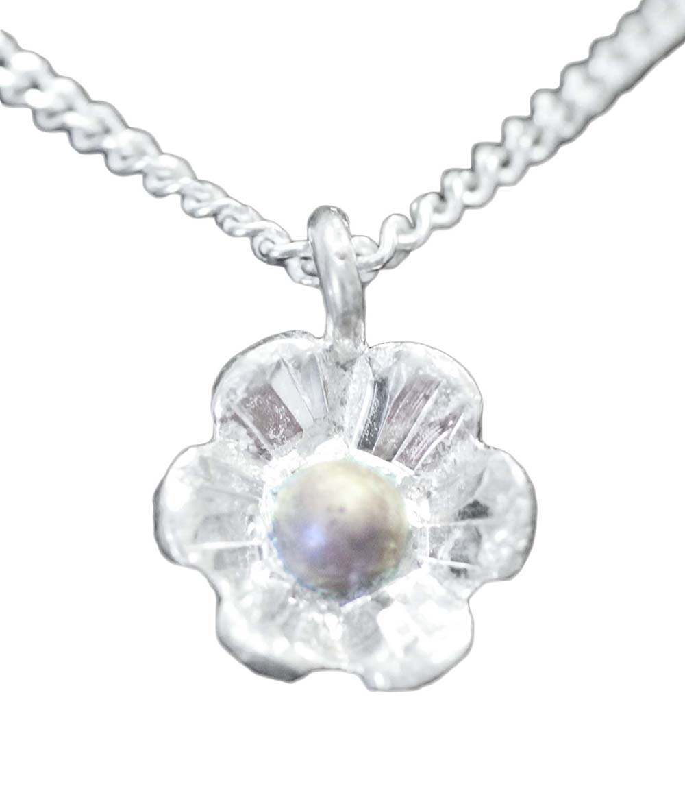 Small Flower Necklace of sterling silver and hand-engraved measuring 3/8″ high.
