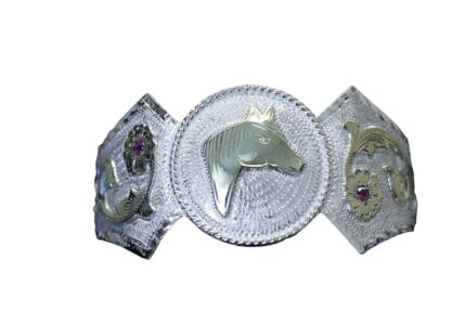 This beautiful hand-engraved, sterling silver bracelet measures 5/8″ wide and 7.5’ long. It features a series of 8 heart conchos linked together into a beautiful accessory for your favorite western wear.